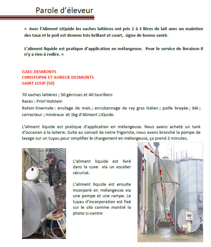 « Avec l’Aliment LIQuide les vaches laitières ont pris 2 à 3 litres de lait avec un maintien des taux et le poil est devenu très brillant et court, signe de bonne santé.
